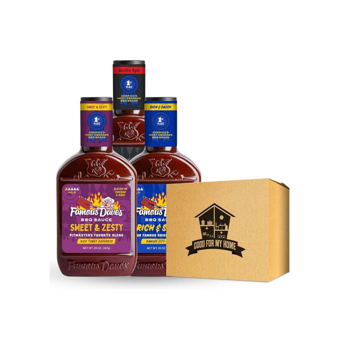 BBQ Sauce Variety Pack Bundle. Three-20 Oz Famous Dave’s BBQ Sauce in a Good For My Home Box. One Each of Famous Daves Barbecue Sauce: Sweet & Zesty, Rich & Tangy, and Devils Spit BBQ Sauce!