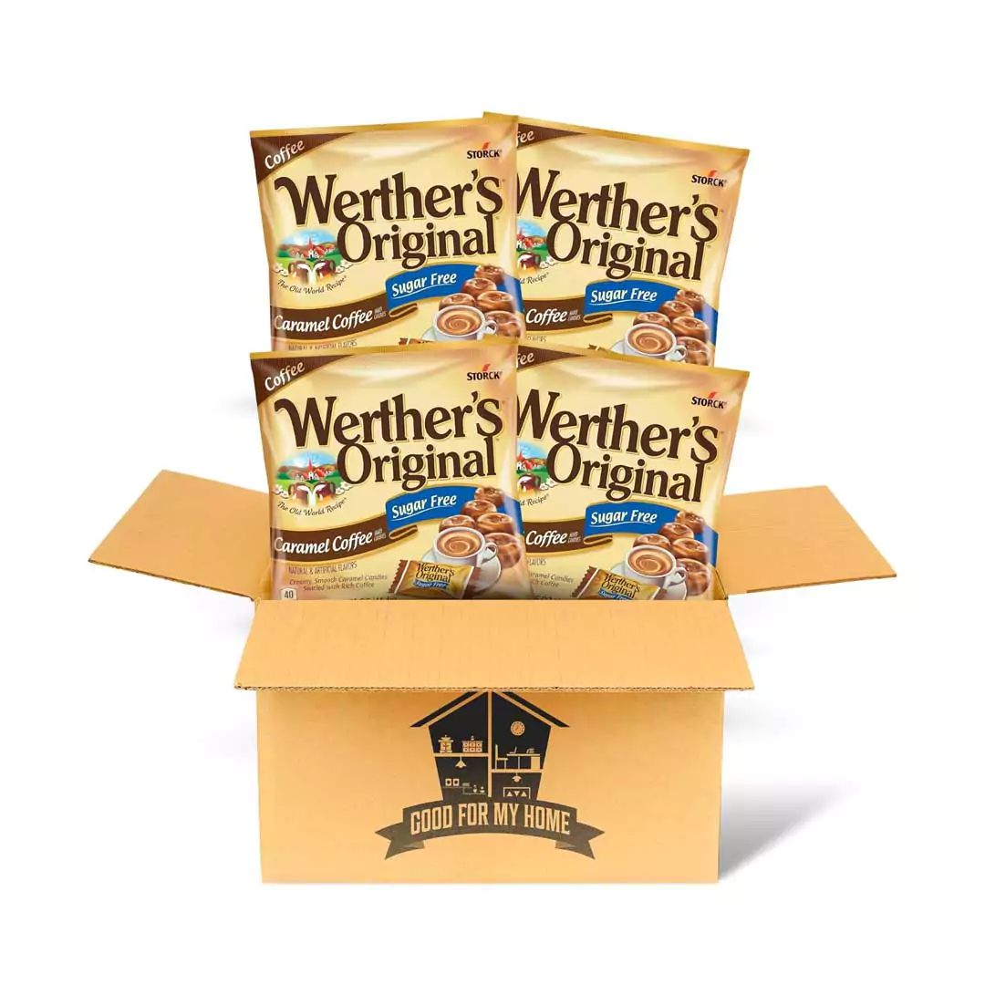 Caramel Coffee Sugar Free Candy Bundle. Includes Four-1.46 Oz Bags of Werthers Original Caramel Coffee Sugar Free Hard Candy in a Good For My Home Box. Werthers Original Hard Candy is Now Sugar Free!