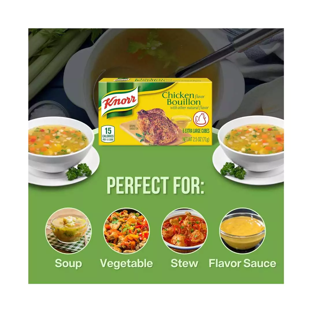 Chicken Bouillon Cubes Bundle. Includes One-2.5 Oz Box of Knorr Chicken Bouillon Cubes in a Good For My Home Box. 6 Extra Large Chicken Bouillon Cubes in a Box! Bouillon Cube is Only 30 Calories!