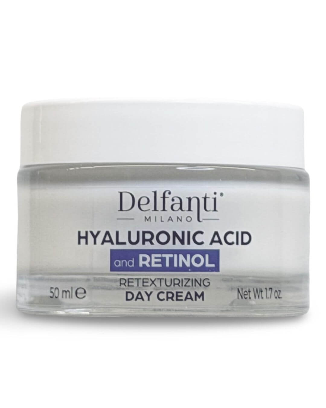 Delfanti-Milano • HYALURONIC ACID and RETINOL • Day Cream • Deep Hydration Retexturizing • Face & Neck Moisturizer • Made in Italy • 1.7 oz jar