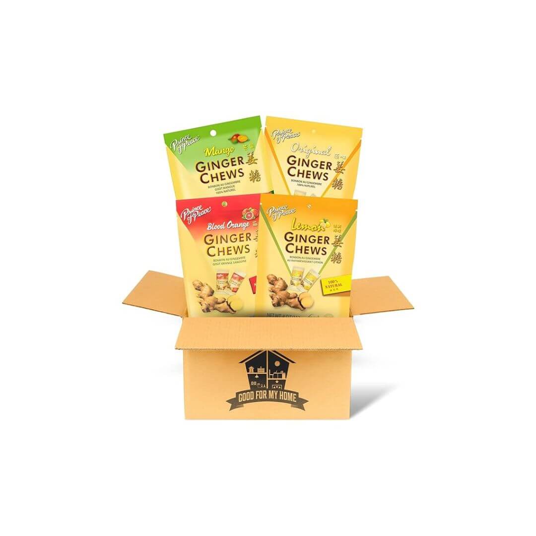 Ginger Chews Variety Pack. Includes Four 4 Oz Princce of Peace Ginger Chews Candy in a Good For My Home Box. One Each Lemon Ginger Chews, Original Ginger Chews, Blood Orange, and Mango Ginger Chews.