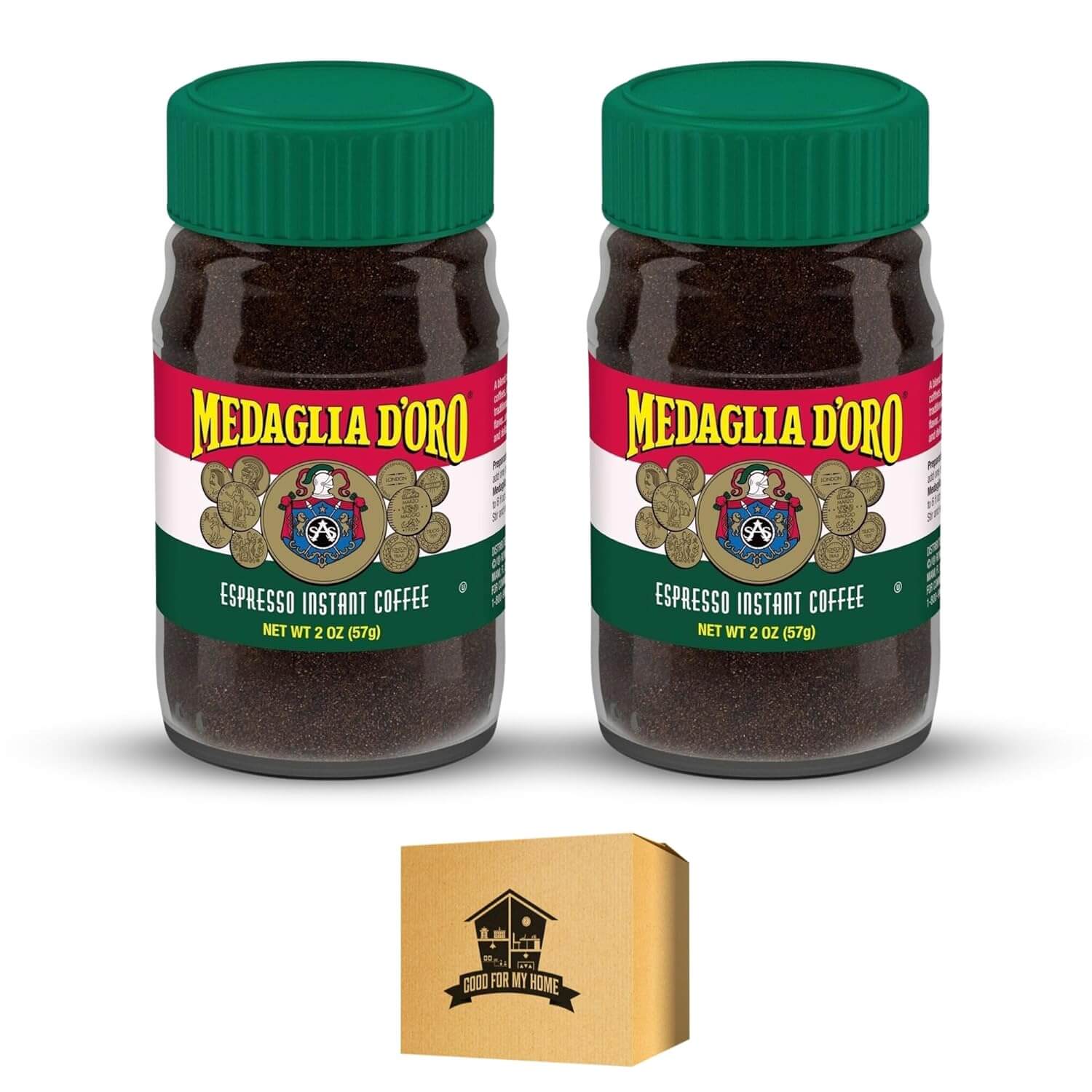 Instant Espresso Coffee Bundle. Includes Two 2 Oz of Medaglia D’Oro Instant Espresso Coffee Powder. Instant Coffee, Double Roast Italian Espresso Coffee. Comes with a Good For My Home Box!