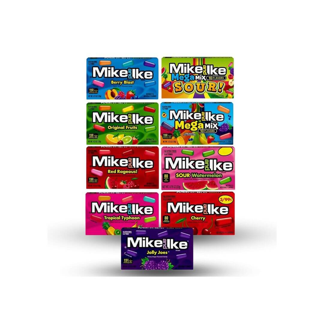 Movie Theater Candy Variety Pack. Includes 9 Flavors of Mike and Ike Candy Plus a Good For My Home Box. Sour Mike and Ike Candy. Fun & Chewy Candy. Assorted Candy Variety Pack for Everyone to Enjoy!