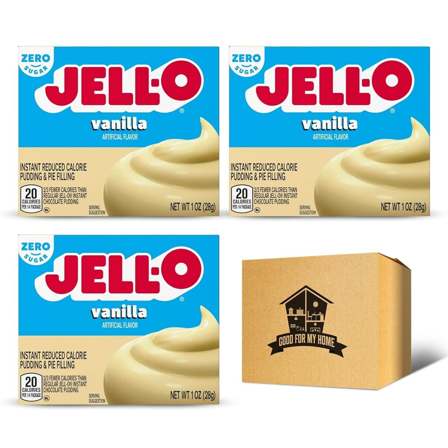 Pudding mix Bundle. Includes Three 1 Oz of Sugar Free Instant Vanilla Pudding Powder Mix. Fat Free, Low Calorie, and Zero Sugar Pudding Vanilla & Pie Filling Mix. Plus a Good For My Home Box!