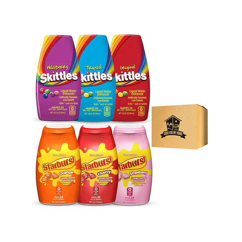 Sugar Free Water Flavoring Drops Variety Pack. Includes Skittles Water Enhancer and Starburst Liquid Water Enhancer in a Good For My Home Box. Four Flavors of Sugar Free Liquid Water Enhancer!