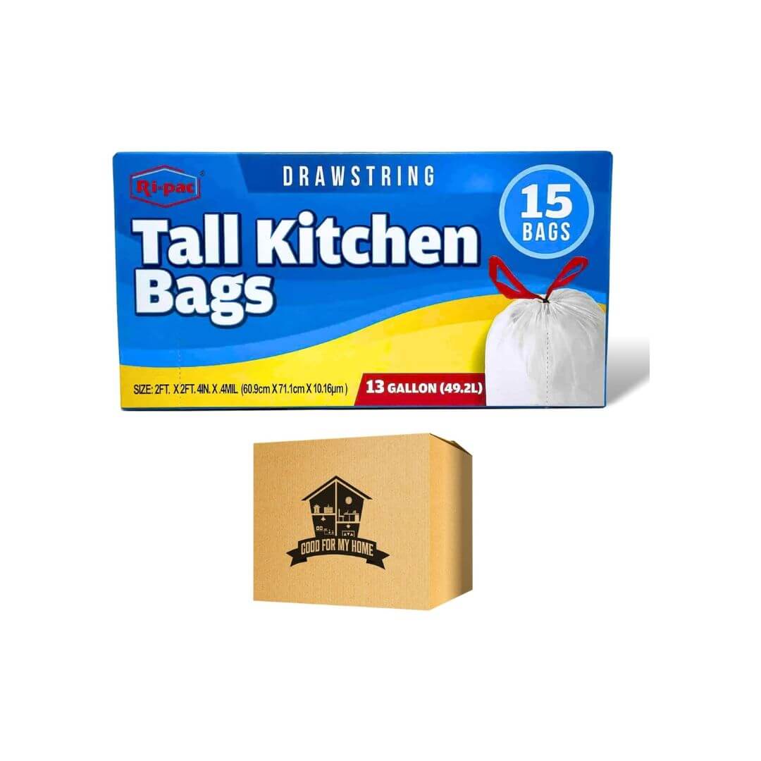 Tall Kitchen Trash Bags Bundle. Includes Three 13 Gallon 15 Bags of Ri Pac 13 Gallon Trash Bags Drawstring. White Trash Bags for Kitchen, and Bathroom Trash Bags. Comes with a Good For My Home Box!