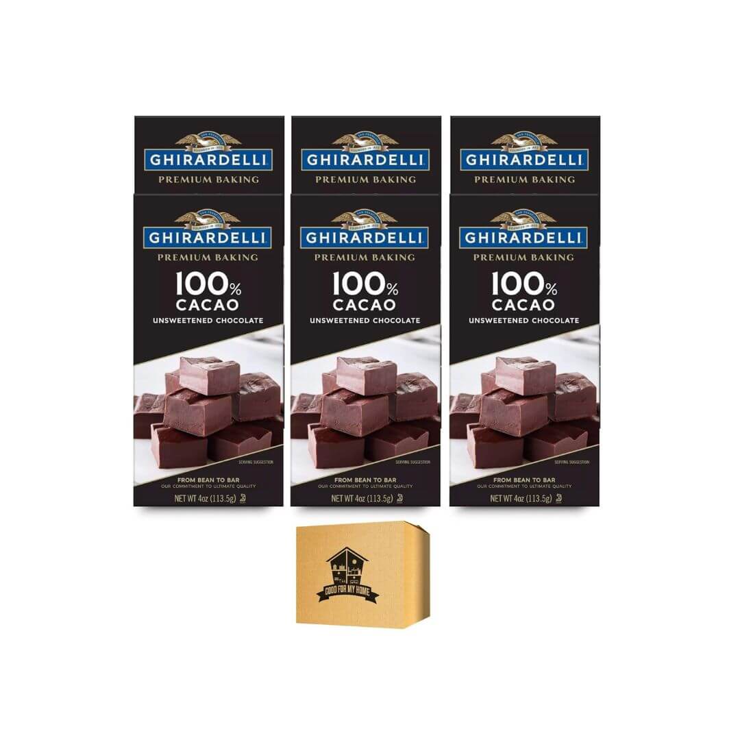 Unsweetened 100% Cacao Baking Chocolate. Includes Six 4oz Bars of Ghirardelli Baking Bar 100% Cacao Unsweetened Chocolate. Ideal for Baking and Cooking. American-Made Excellence by Ghirardelli. Perfect Rich Flavor in Every Bite. Comes with a Good For My Home Box!Unsweetened 100% Cacao Baking Chocolate. Includes Six 4oz Bars of Ghirardelli Baking Bar 100% Cacao Unsweetened Chocolate. Ideal for Baking and Cooking. American-Made Excellence by Ghirardelli. Perfect Rich Flavor in Every Bite. Comes with a Good For My Home Box!