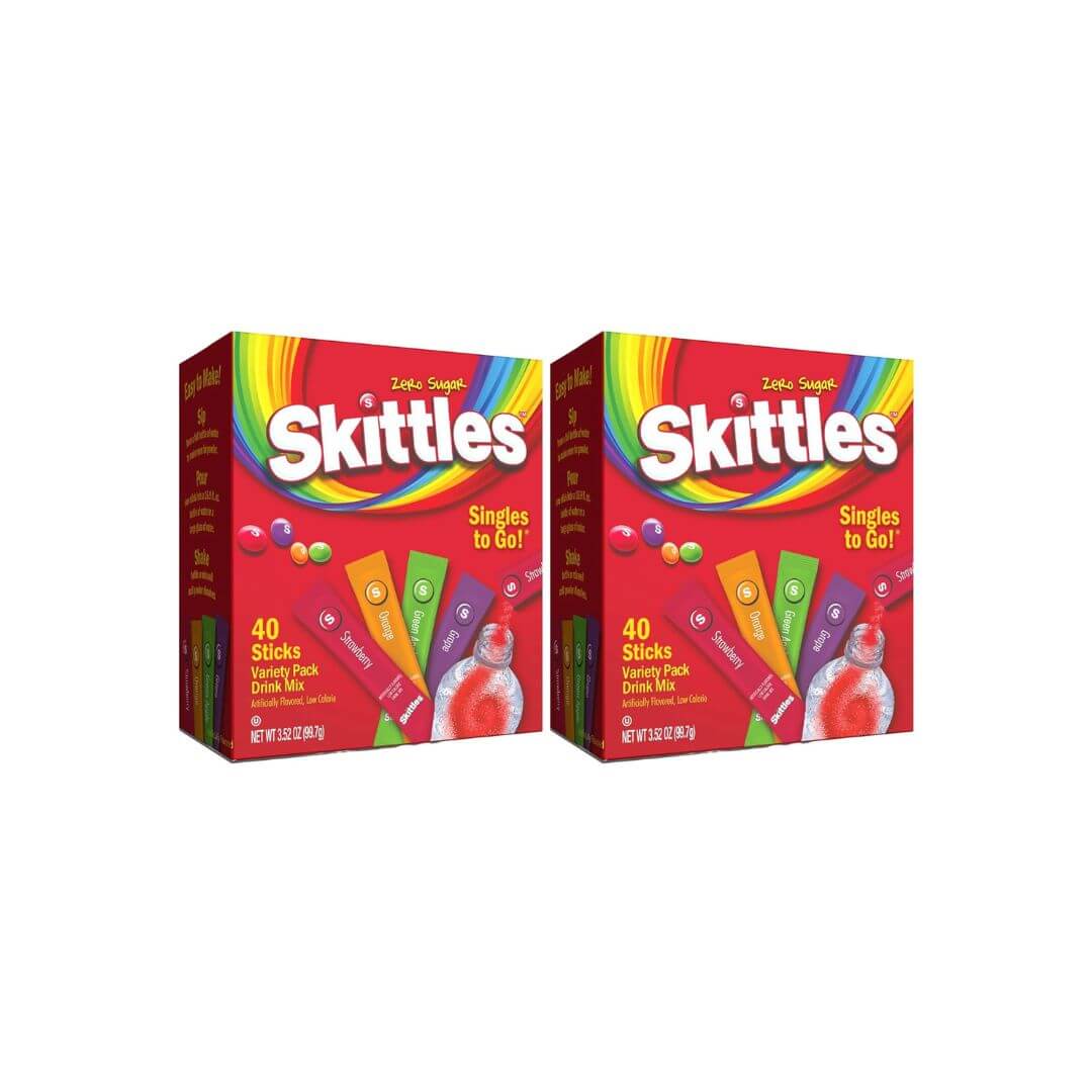Zero Sugar Drink Mix Packets Bundle. Two- 40 Ct Boxes of Skittless Drink Mix Packets in a Good For My Home Box. 80 Skittless Singles To Go Drink Mix. 4 Flavors: Strawberry, Orange, Green Apple & Grape